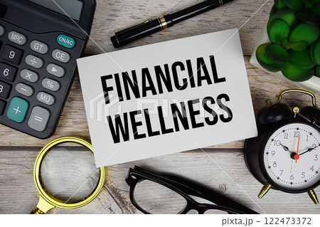 Financial wellness text with calculator, magnifying glass and alarm clock on wooden background