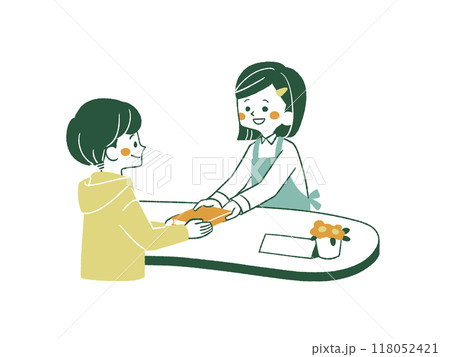 笑顔で本を持っているエプロンを着用した女性-4色