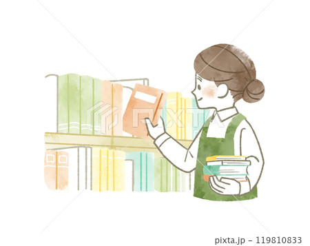 本棚に本を出し入れしているエプロンを着用した女性-水彩