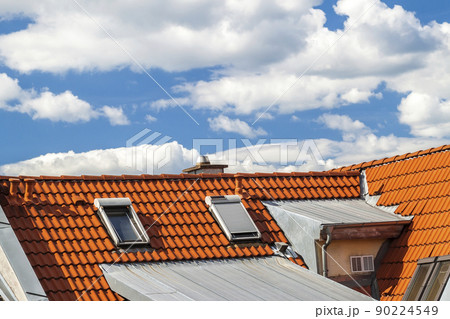 Roof of house with windows and yellow roof tiles