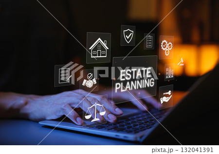 Estate Planning and Asset Management Concept. Person working on laptop in financial or legal setting with icons of legal documents, contracts, property, inheritance, law and wealth management.