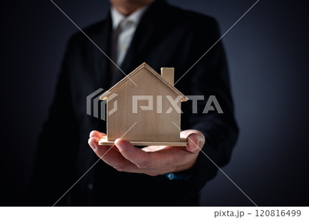businessman holding simulated wooden house and a key. icon family on table, donation, saving, charity, family finance plan concept, fundraising, superannuation, investment, financial crisis concept.