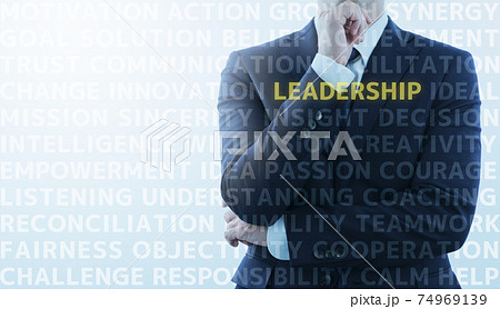 リーダーの資質に関する言葉と、リーダーシップについて考える男性。逆光とフレア。