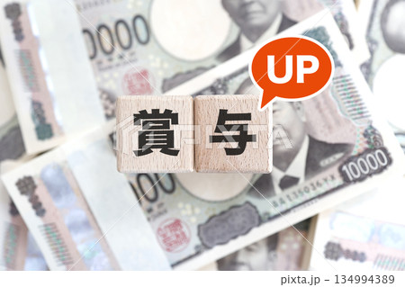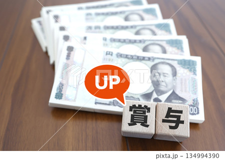 賞与UPとボーナス増加を示す札束と木製ブロック。