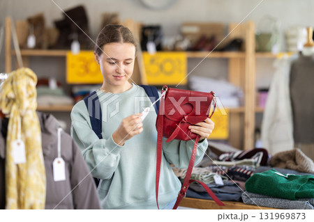 Happy teenage girl choosing ladies' handbag in clothing shop with large assortment