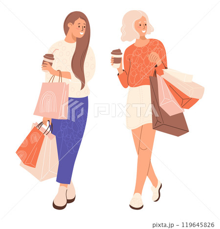 Shopping. Happy woman friends buyers. Brunette and blonde girl with takeaway coffee and shopping packages. Vector illustration. Cute female character