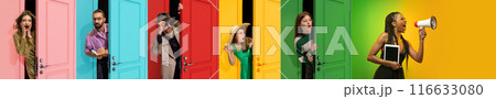 Vibrant collage with different young emotional people peeking out colorful doors with excitement. Big sales season announcement