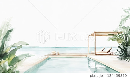 Experience a serene luxury spa retreat with minimalist watercolor elements capturing relaxation by the tranquil waters during peaceful moments of leisure
