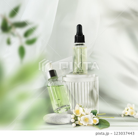 Beautifully designed skincare serum bottles with floral accents and soft textures evoke luxury
