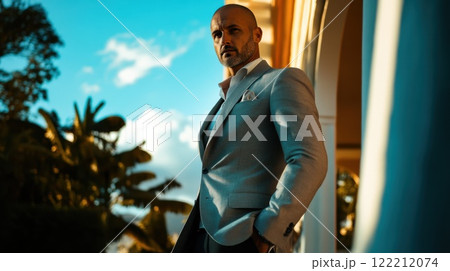 Sophisticated man posing elegantly outdoors in a stylish gray suit against a tropical backdrop during golden hour