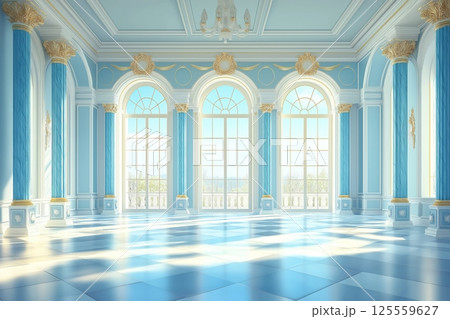 Sunlight illuminates blue grand hall through large windows in palace or castle, surrounded by lush greenery