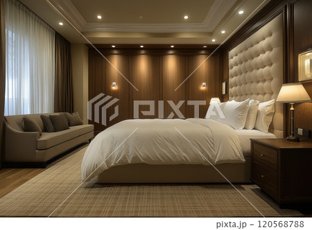 modern hotel room featuring light wood and beige tones, with spacious layout, elegant furnishings, and soft lighting creating cozy atmosphere