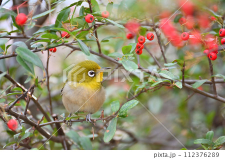 ピラカンサの実を食べるメジロ