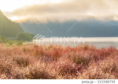【山梨県】河口湖大石公園 朝の光を浴びて、朝露が光る湖畔のコキア