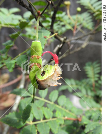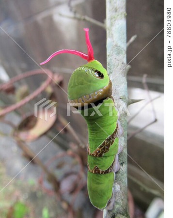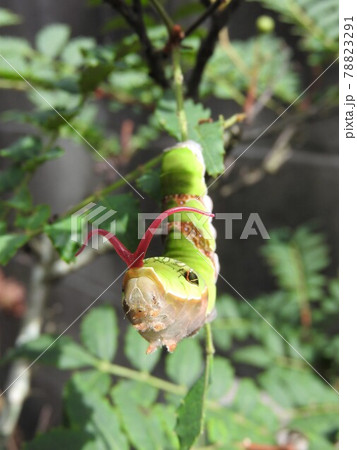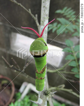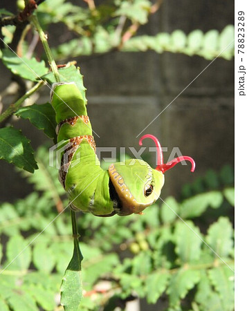 クロアゲハの幼虫(刺激を受けて赤い臭角を出した状態)