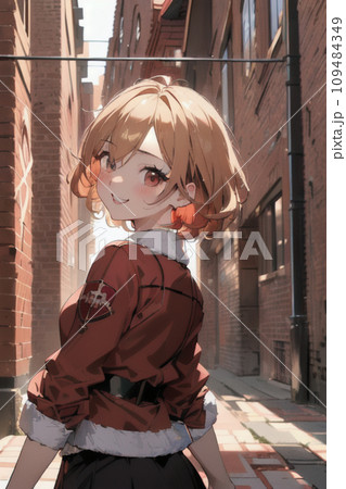 レンガの街を行く赤い服の女の子
