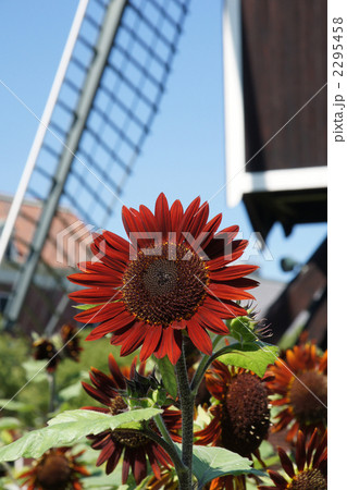 風車と赤い向日葵