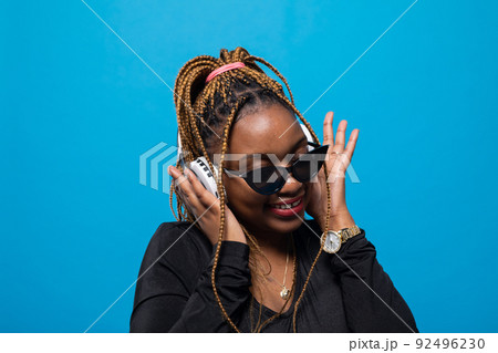 A close-up view of a dark-skinned girl with headphones on her ears.