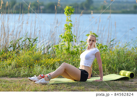 Young beautiful woman girl lady blond hair with red lips in casual style american bulldog.