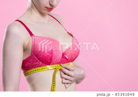 Woman measures her chest circumference under her breasts. Young girl on pink background.