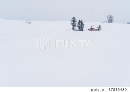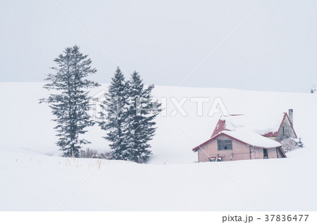 冬の美瑛 赤い屋根のある丘