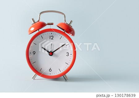 Colored wooden clips and wooden pieces with red alarm clock on a red background.