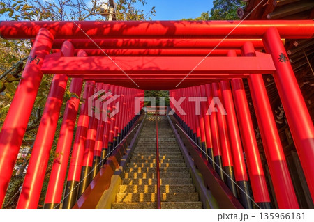 神社に続く鮮やかな朱色の千本鳥居と石段の風景