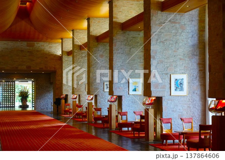 石積みの柱と赤い絨毯が美しい格調高いホテルのロビー