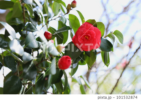 色鮮やかな赤いツバキ 【空バック】