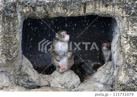 雨宿りをするニホンザルのオス