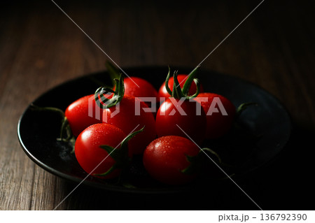 ミニトマト、プチトマト、トマト、フォークとスプーンのテーブルイメージ。