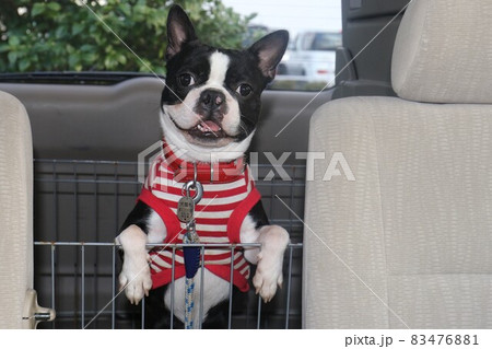 ドライブ好きな愛犬ボストンテリアのマイティが赤いボーダーシャツを着て車内で可愛い笑顔で見つめています