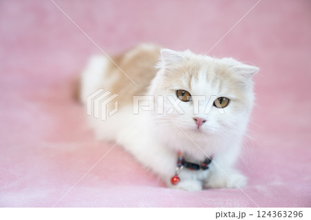 ピンクバックと赤い鈴をつけたスコティッシュフォールド