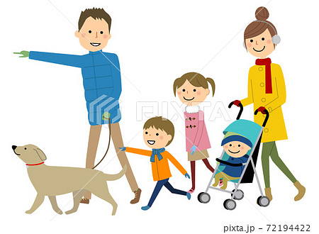 犬の散歩をする仲良しファミリー