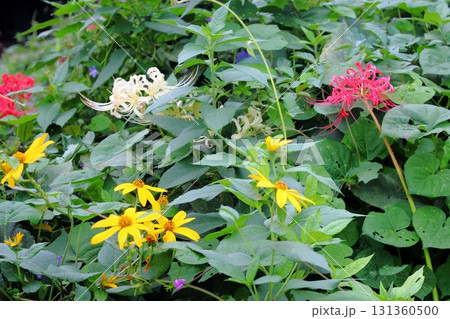彼岸の頃咲く赤と白の彼岸花群生