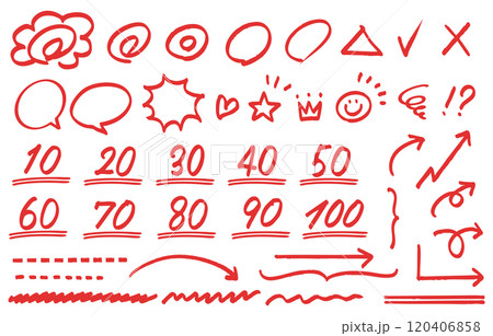 テスト採点に使う手書きの点数、花丸、矢印等のセット(赤)