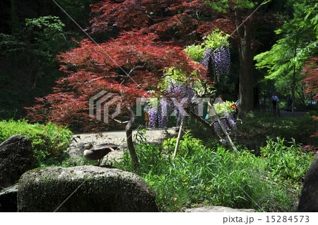 新緑の赤モミジと藤の花