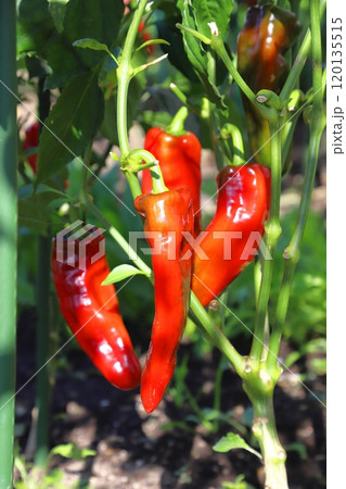 家庭菜園で収穫したばかりの完熟の赤南蛮、白バック