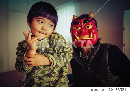 節分で母親が扮する鬼に本気でびっくりしている4歳男児