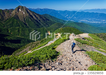 八ヶ岳連峰・硫黄岳の登りから見る赤岩ノ頭の登山者と阿弥陀岳・南アルプス