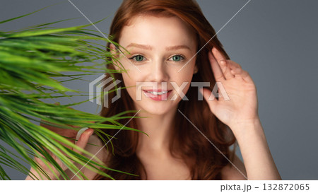 Ginger-Haired Young Lady Posing Touching Green Plant Looking At Camera Standing In Studio On Gray Background. Youth And Wellness. Natural Female Beauty Portrait Concept
