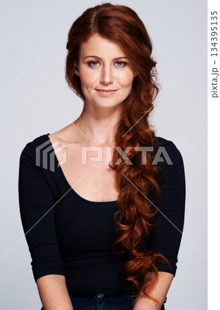 Beauty, hair and braid with portrait of woman for salon, red head and cosmetology. Smile, shampoo and stylist with female model isolated on white background for haircut, ginger and cosmetics