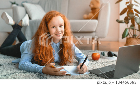 Online Education. Positive red-haired teenage girl lying on the floor carpet with laptop and writing in notebook. Pupil watching lecture or webinar, studying at home using internet, looking at camera