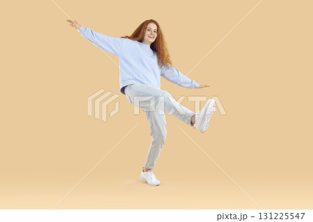 Funny teenage girl in trendy and comfortable casual outfit having fun on light beige background.