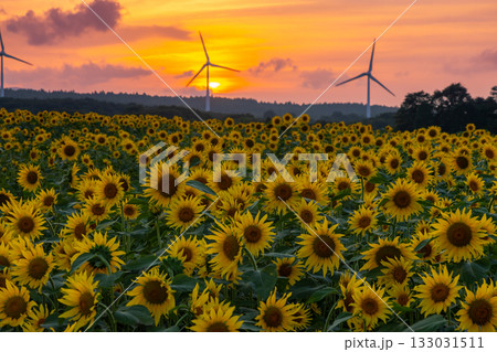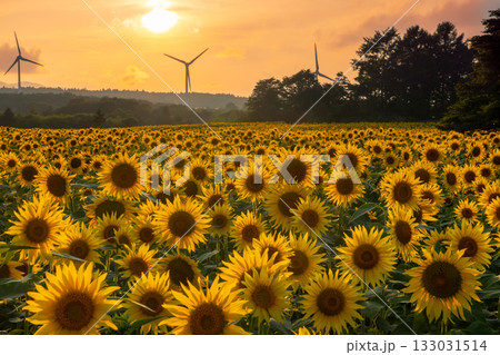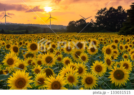 福島県郡山市湖南町赤津 郡山布引風の高原の風力発電の風車の下に広がる満開のひまわり畑と夕陽と夕焼け空