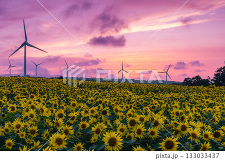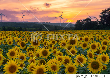 福島県郡山市湖南町赤津 郡山布引風の高原の風力発電の風車の下に広がる満開のひまわり畑と夕焼け空