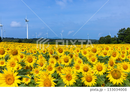 福島県郡山市湖南町赤津 郡山布引 風の高原の風力発電の風車の下に広がる満開のひまわり畑