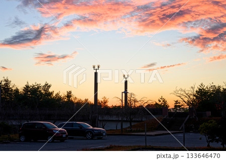 雨上がりの夕空に現れた見事な夕焼け 公園のブランコを照らす夕焼け雲 奈良の市街地にて