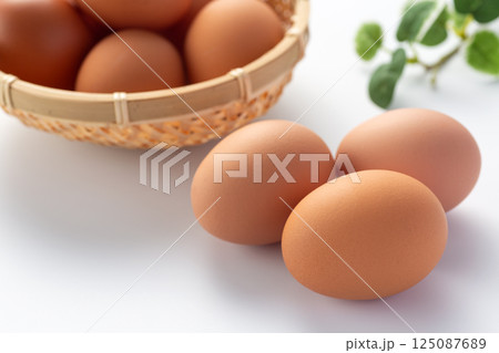 竹かごに入った鶏の卵(赤玉)のクローズアップ