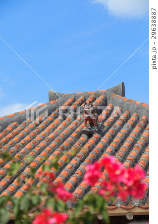 沖縄県 竹富島 琉球赤瓦屋根のシーサーとブーゲンビレアの花